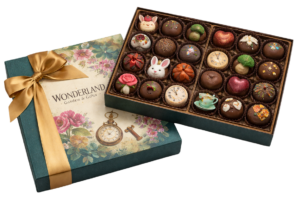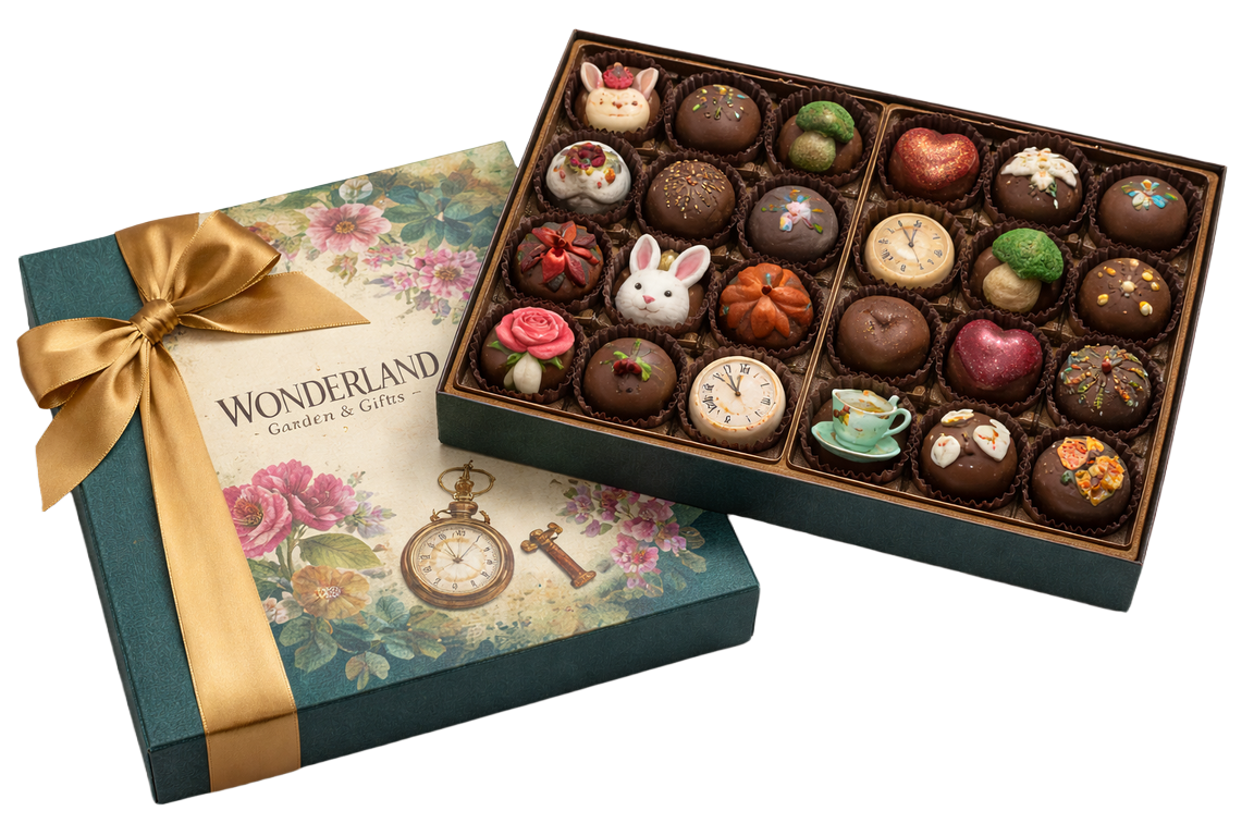 A dark green box with decorative floral print. Inside are 24 decorative Alice in Wonderland themed truffles with a creamy, smooth ganache center.